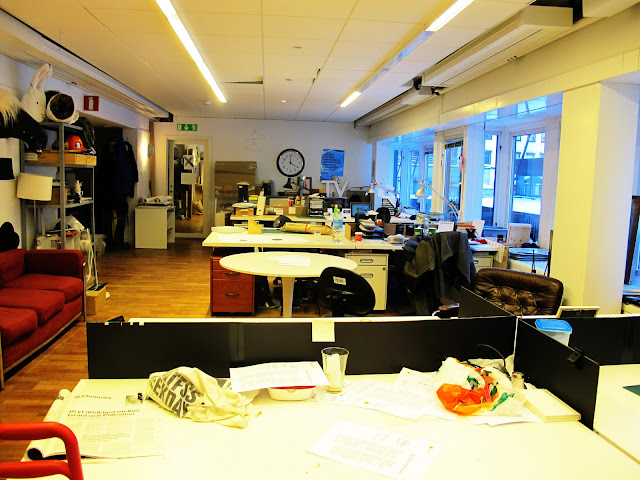 Helt tomt och så jag. Beckmans kl. 16.11. Exjobbet har tagit sin början, folk häckar på ställen som det går att tänka på. Jag stannar i skolan och får på köpet ett helt kontor för mig själv.